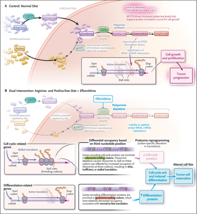 Los autores concluyen que las intervenciones metabólicas, como las dietas diseñadas, pueden inducir diferenciación en cánceres pediátricos, proponiendo un enfoque complementario a las terapias existentes. El estudio sostiene que la traducción selectiva, influenciada por la disponibilidad de poliaminas, representa un nuevo mecanismo para reprogramar el destino celular y sugiere que patrones de uso de codones en el ADN pueden estar relacionados con el metabolismo y la naturaleza de la proliferación celular.
