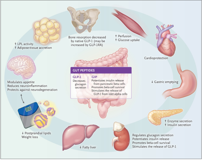 Los agonistas del GLP-1, como exenatida, liraglutida, semaglutida y tirzepatida, han demostrado ser herramientas efectivas en el control de la diabetes tipo 2 y la obesidad, mostrando múltiples mecanismos de acción con relevantes implicaciones clínicas.
